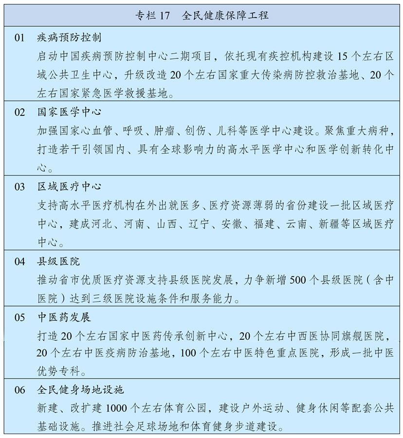 改革疾病预防控制体系,强化监测预警、风险评估、流行病学调查、检验检测、应急处置等职能。建立稳定的公共卫生事业投入机制,改善疾控基础条件,强化基层公共卫生体系。落实医疗机构公共卫生责任,创新医防协同机制。完善突发公共卫生事件监测预警处置机制,加强实验室检测网络建设,健全医疗救治、科技支撑、物资保障体系,提高应对突发公共卫生事件能力。建立分级分层分流的传染病救治网络,建立健全统一的国家公共卫生应急物资储备体系,大型公共建筑预设平疫结合改造接口。筑牢口岸防疫防线。加强公共卫生学院和人才队伍建设。完善公共卫生服务项目,扩大国家免疫规划,强化慢性病预防、早期筛查和综合干预。完善心理健康和精神卫生服务体系。